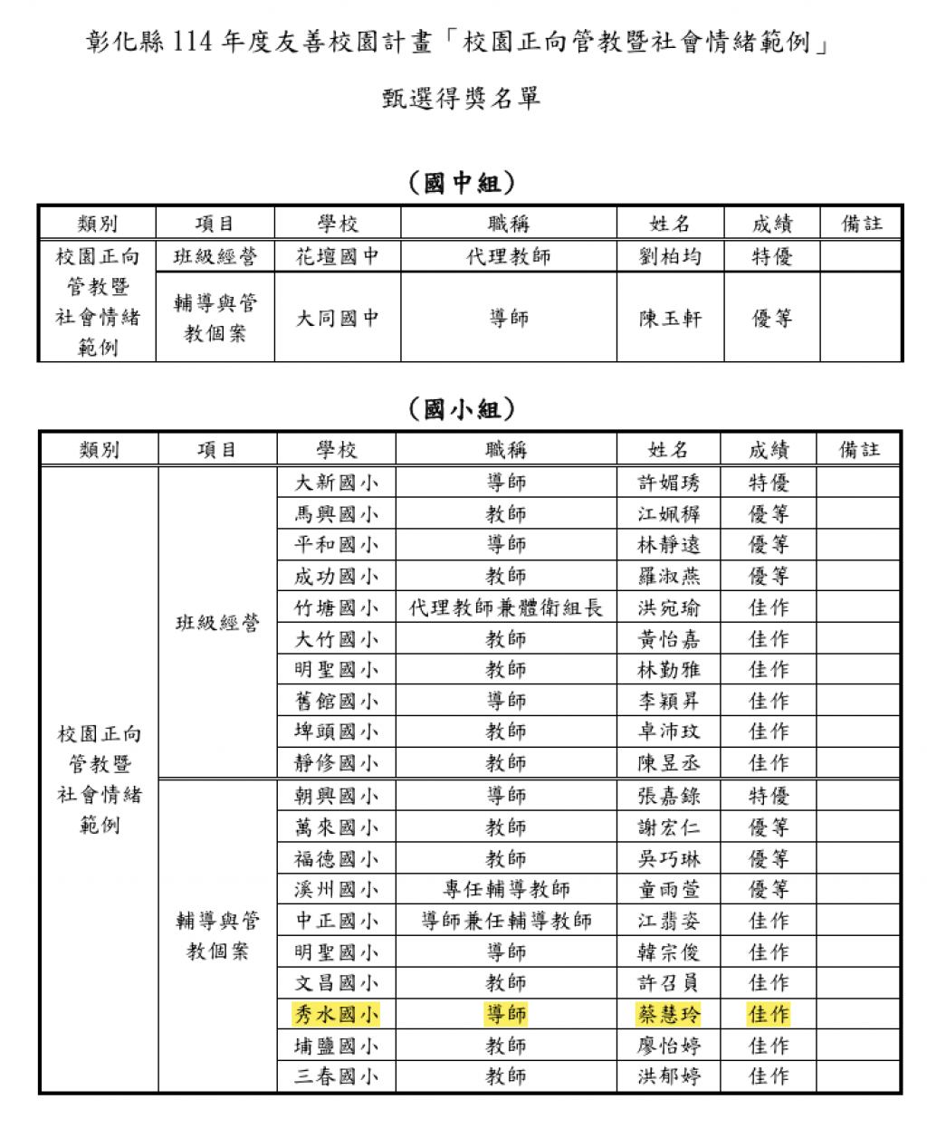 賀!本校蔡慧玲老師參加彰化縣114年度校園正向管教暨社會情緒範例甄選活動「輔導與管教個案」組 , 榮獲佳作 !