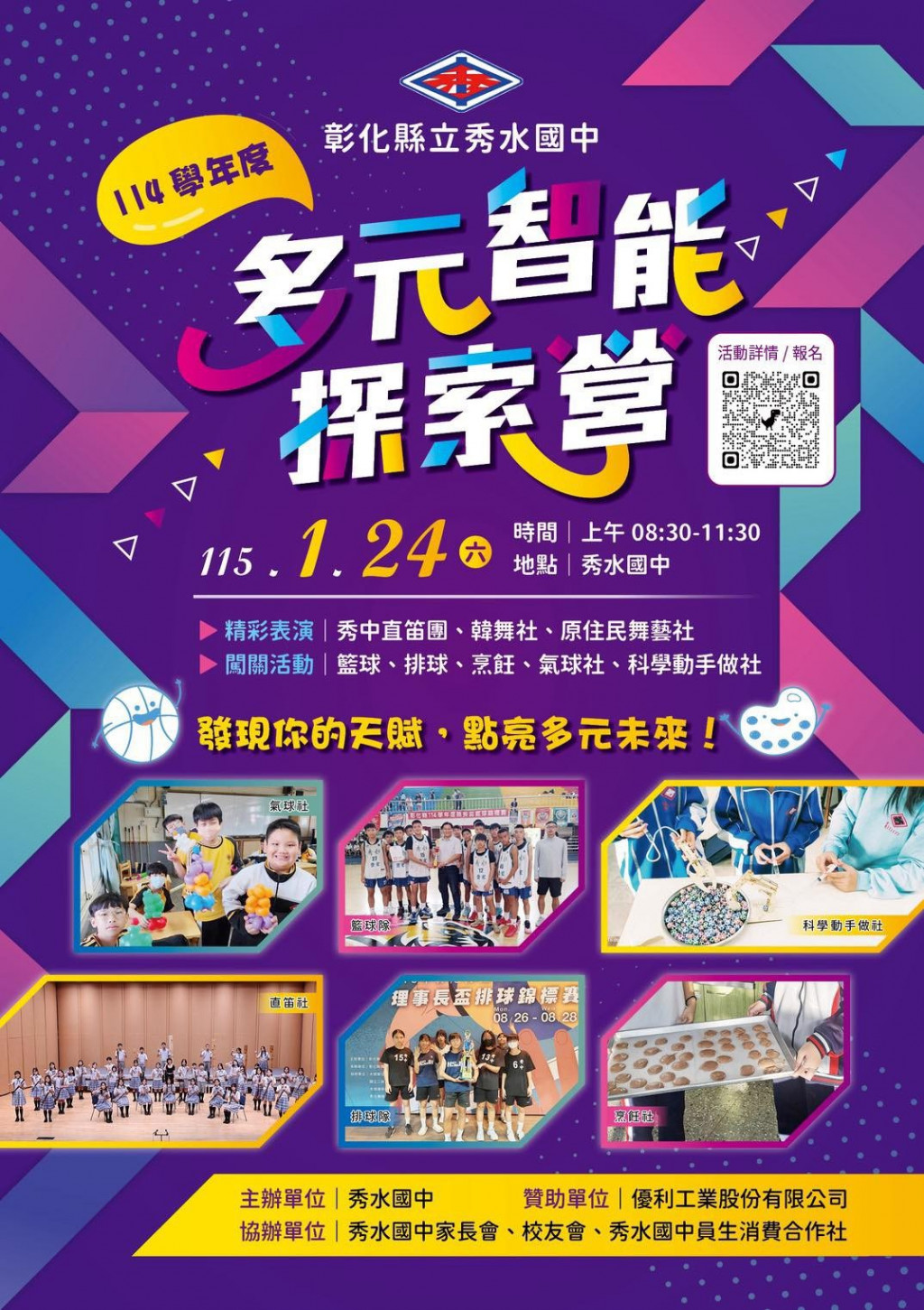 歡迎學區內小學五六年級同學相招來參加體驗活動,115年1月24日(六)秀水國中多元智能探索營登場!