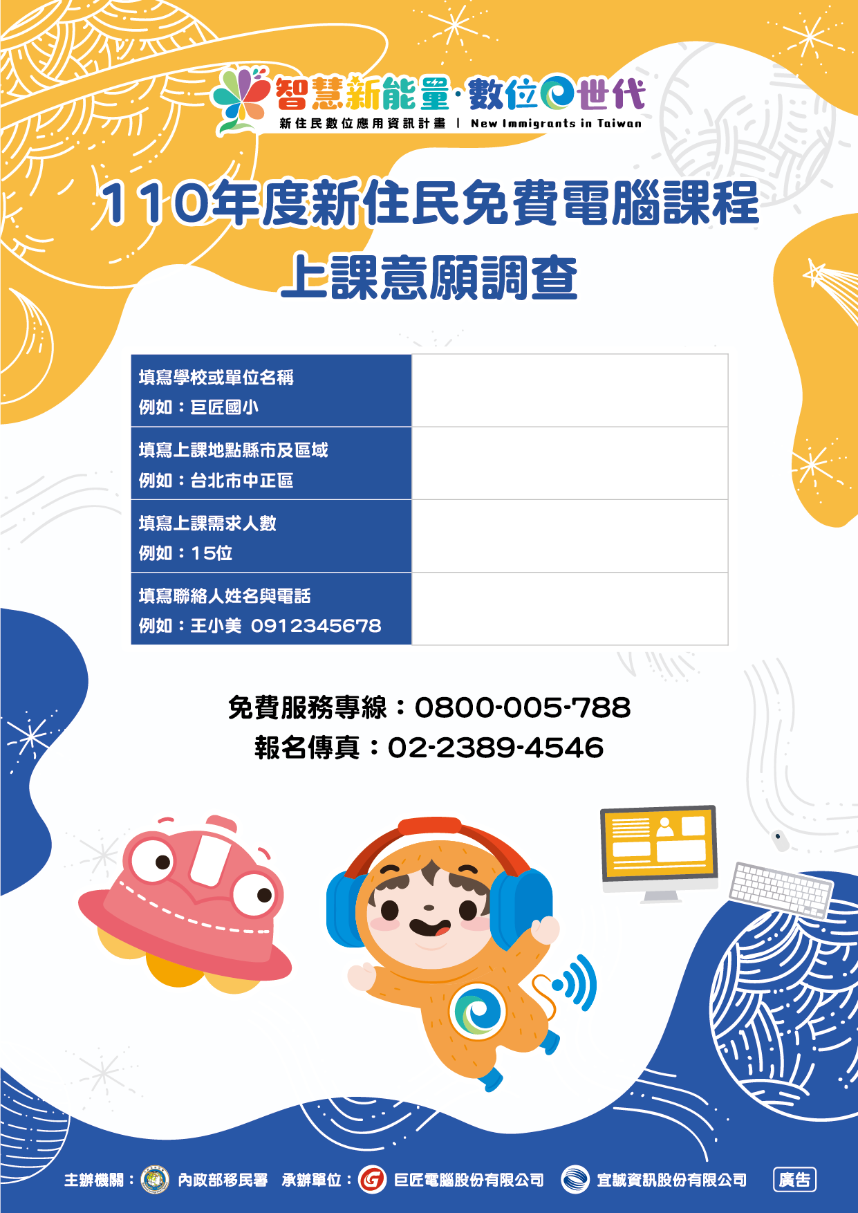 及新住民子女免費電腦課程實體教育訓練,課程資訊詳如附件1_資訊課程簡介,若有上課意願請線上填寫
